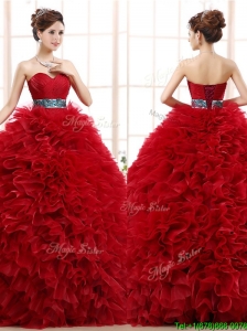 Luxurious Sashed and Ruffled Sweet 16 Dress in Wine Red