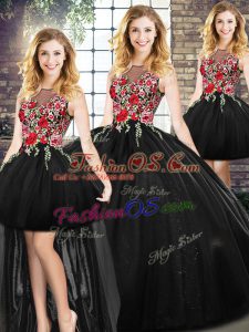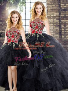 Black Sleeveless Floor Length Embroidery Zipper Quince Ball Gowns