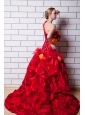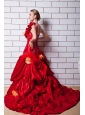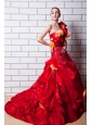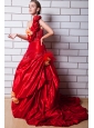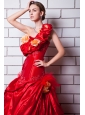 Home >  Wedding Dresses >  Elegant Wedding Dresses > Red A-line One Shoulder Court Train Taffeta Appliques and Hand Made Flowers Wedding Dress