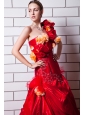 Red A-line One Shoulder Court Train Taffeta Appliques and Hand Made Flowers Wedding Dress