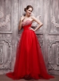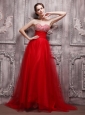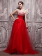 Red A-Line Sweetheart Brush Train Net Beading Prom Dress