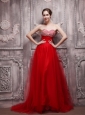 Home >  Prom Dresses >  Beautiful Prom Dresses > Red A-Line Sweetheart Brush Train Net Beading Prom Dress