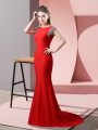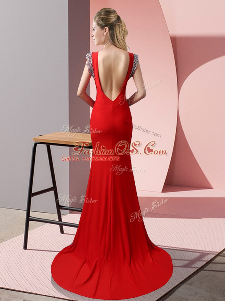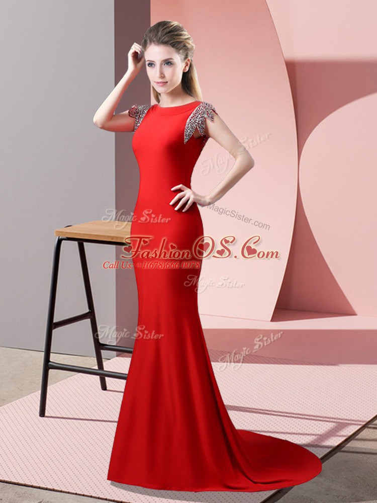 Red Backless High-neck Beading Prom Gown Elastic Woven Satin Short Sleeves Brush Train