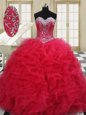Red Ball Gown Prom Dress Military Ball and Sweet 16 and Quinceanera and For with Beading Sweetheart Sleeveless Lace Up