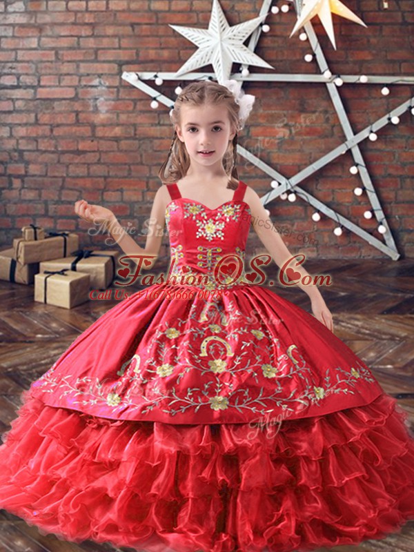 Red Ball Gowns Embroidery and Ruffled Layers Child Pageant Dress Lace Up Satin and Organza Sleeveless Floor Length