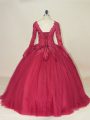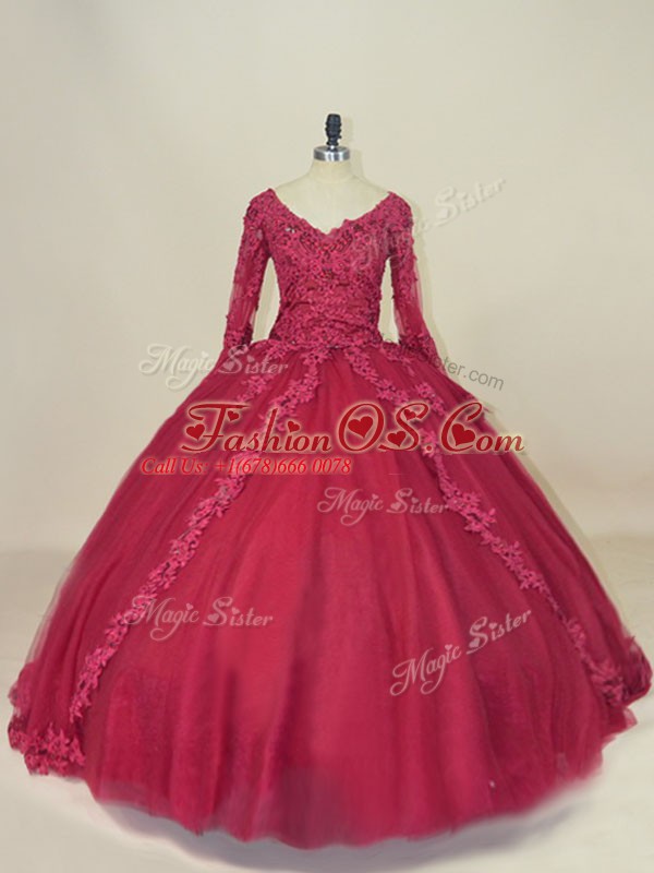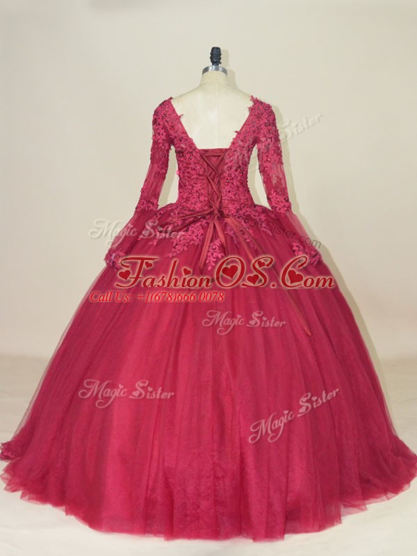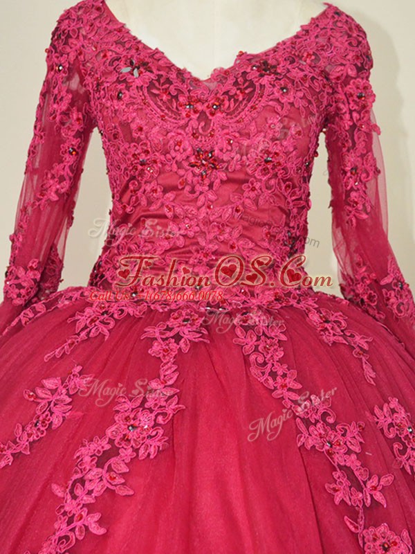 Red Ball Gowns Lace and Appliques Quinceanera Dress Lace Up Tulle Long Sleeves Floor Length