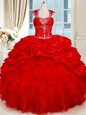 Home >  Quinceanera Dresses >  Sweet 16 Dresses > Red Ball Gowns Ruffles and Pick Ups Quince Ball Gowns Backless Organza and Taffeta Cap Sleeves Floor Length