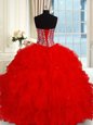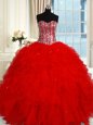 Red Ball Gowns Sweetheart Sleeveless Tulle Floor Length Lace Up Ruffles and Sequins 15th Birthday Dress