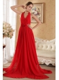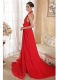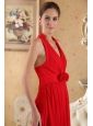 Red Column / Sheath Halter Court Train Chiffon Hand Made Flowers and Ruch Prom / Evening Dress
