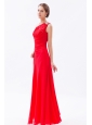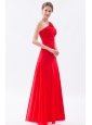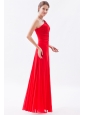 This red prom dress caters for any occasion you will attend. The fitted bodice with one shoulder style encrusted lovely beadings and exquisite ruchings, while the wide strap divides into three spaghetti straps. The floor length skirt flows freely to contour your slim figure and a hidden zipper up in the back completes this tasteful design.
