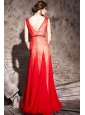 Size the day at your 2011 Quincea?era or prom.This v neck red ruched prom dress with beadings on the bodice and a ruched band contours the waist.What's more the sedutive open back will make you more charming.