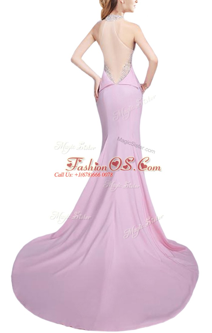 Red Elastic Woven Satin Side Zipper Halter Top Sleeveless Prom Dress Brush Train Beading