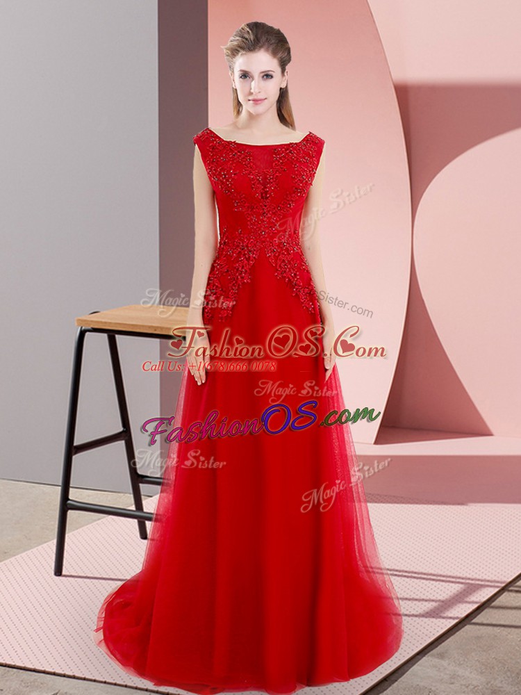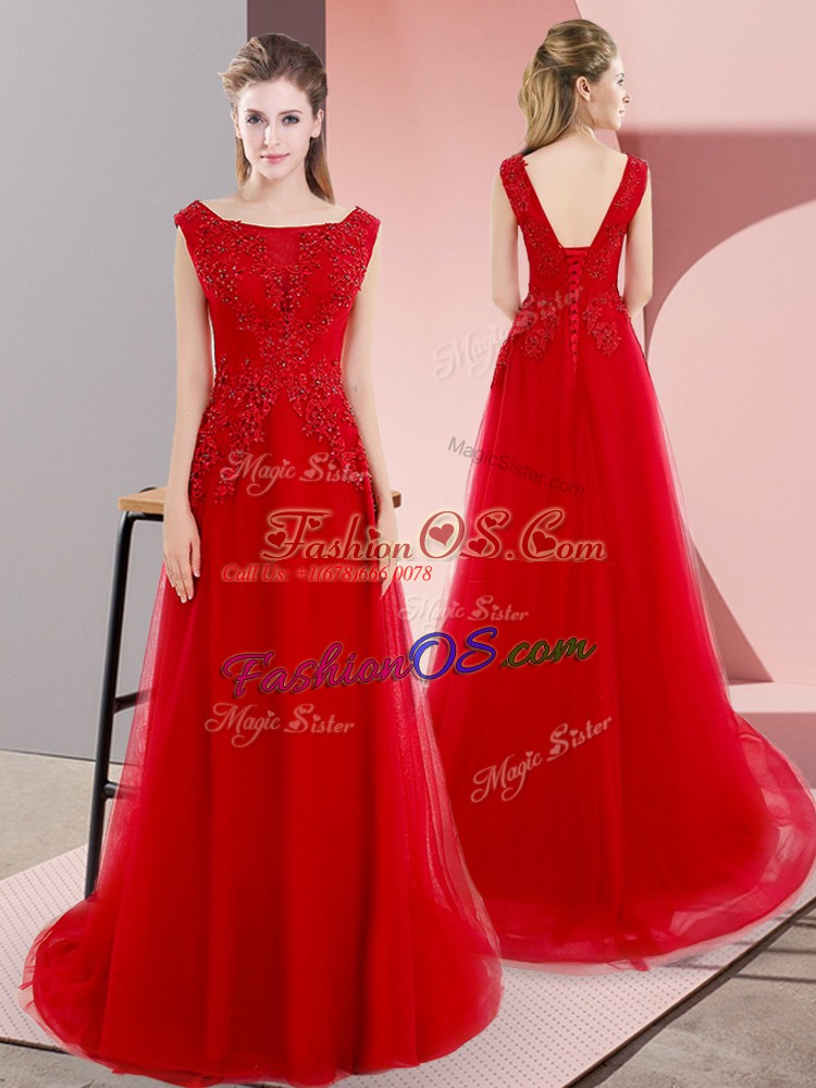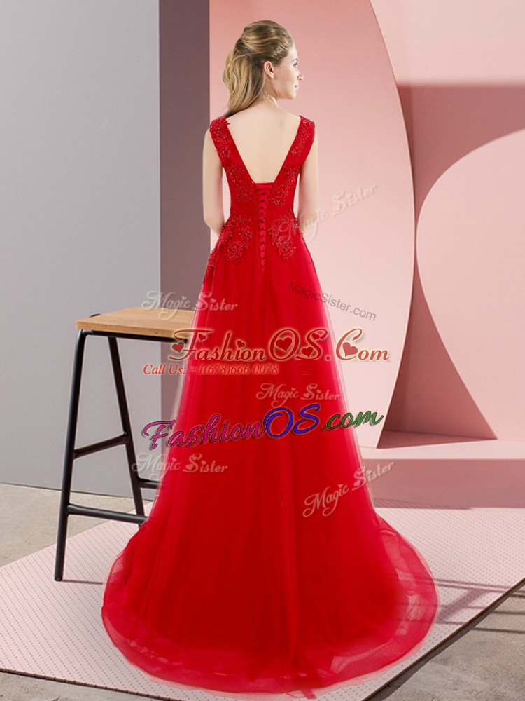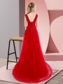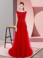 Red Empire Beading and Appliques Lace Up Tulle Sleeveless