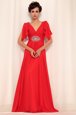 Home >  Prom Dresses >  Popular Prom Dresses > Red Empire Chiffon V-neck Short Sleeves Beading Floor Length Zipper