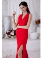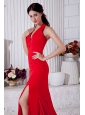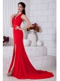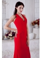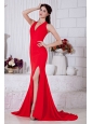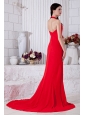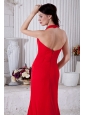 Red Empire Halter Prom / Evening Dress Brush Train Chiffon