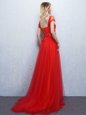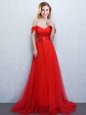 Home >  Special Occasion Dresses >  Dama Dresses for Quinceanera > Red Empire Off The Shoulder Sleeveless Tulle With Brush Train Lace Up Appliques and Ruching Dama Dress for Quinceanera