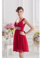 Red Empire Straps Prom Dress with Ribbons and Beading