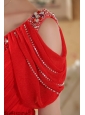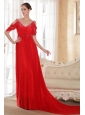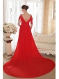 Red Empire V-neck Chapel Train Chiffon Beading Prom Dress