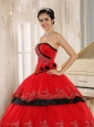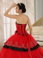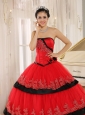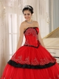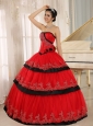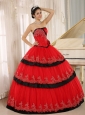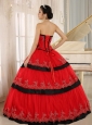 Wonderful work of handmade flowers and applique. You are the spotlight of the ball when you walk into the party in this dress. It features a strapless bodice with straight neckline in the delicate flowers and applique. It's a perfect design of red and black. The popular lace up back completes the look. This floor-length quinceanera dress will sure to dance the night away.