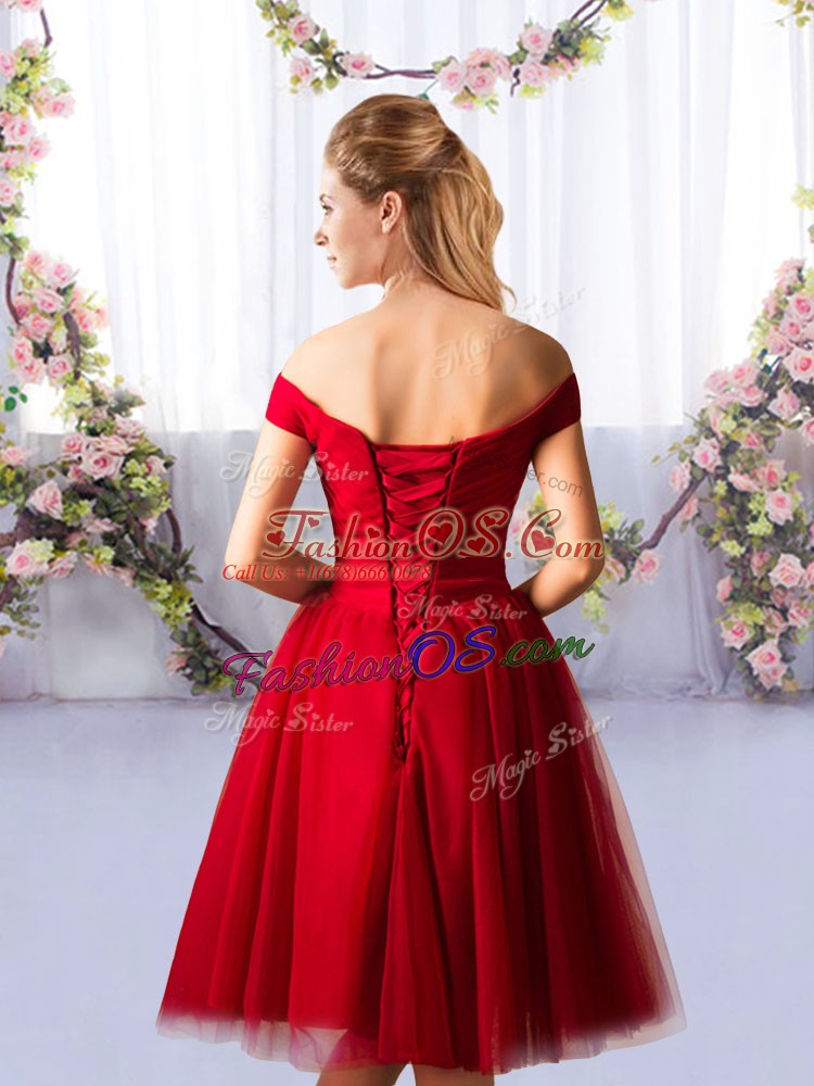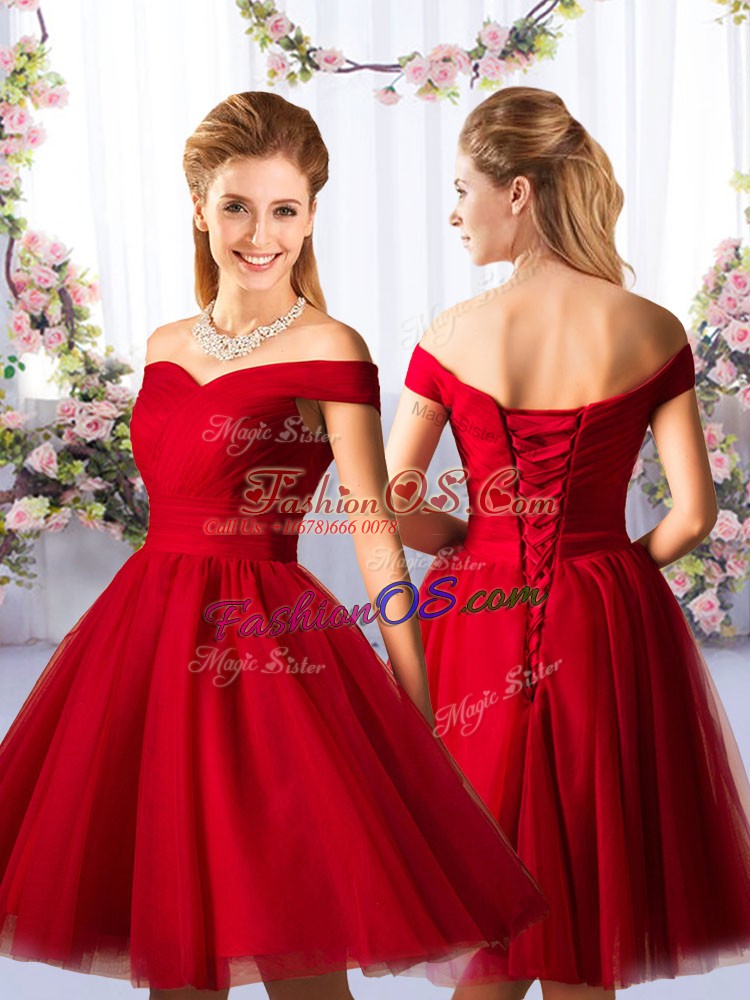 Red Lace Up Bridesmaid Dresses Ruching Sleeveless Knee Length