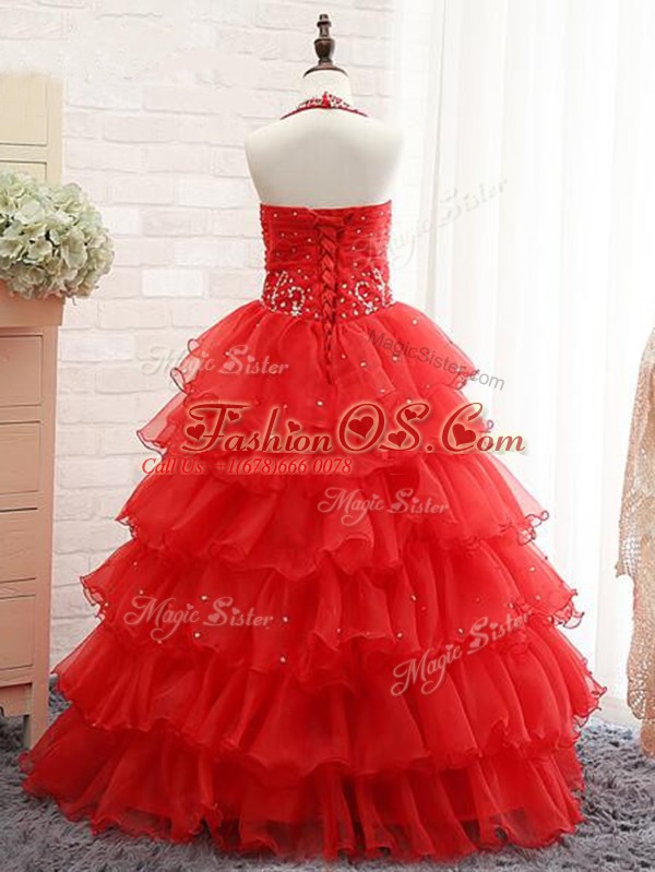 Home >  Special Occasion Dresses >  Mini Quinceanera Dresses > Red Lace Up Halter Top Beading and Ruffled Layers Little Girls Pageant Gowns Organza Sleeveless