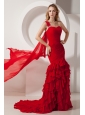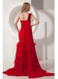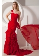 Red Mermaid Watteau  Ruffles Prom Dress One Shoulder Train Chiffon