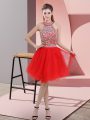 Red Organza Backless Halter Top Sleeveless Knee Length Beading
