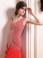 Home >  Prom Dresses >  Best Prom Dresses > Red Prom / Evening Dress With Beaded Decorate Up Bodice High Slit Court Train Chiffon V-neck