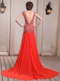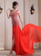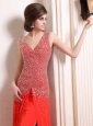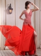 Red Prom / Evening Dress With Beaded Decorate Up Bodice High Slit Court Train Chiffon V-neck
