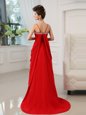 Red Prom Gown Prom and Party and For with Beading and Ruching Spaghetti Straps Sleeveless Brush Train Zipper