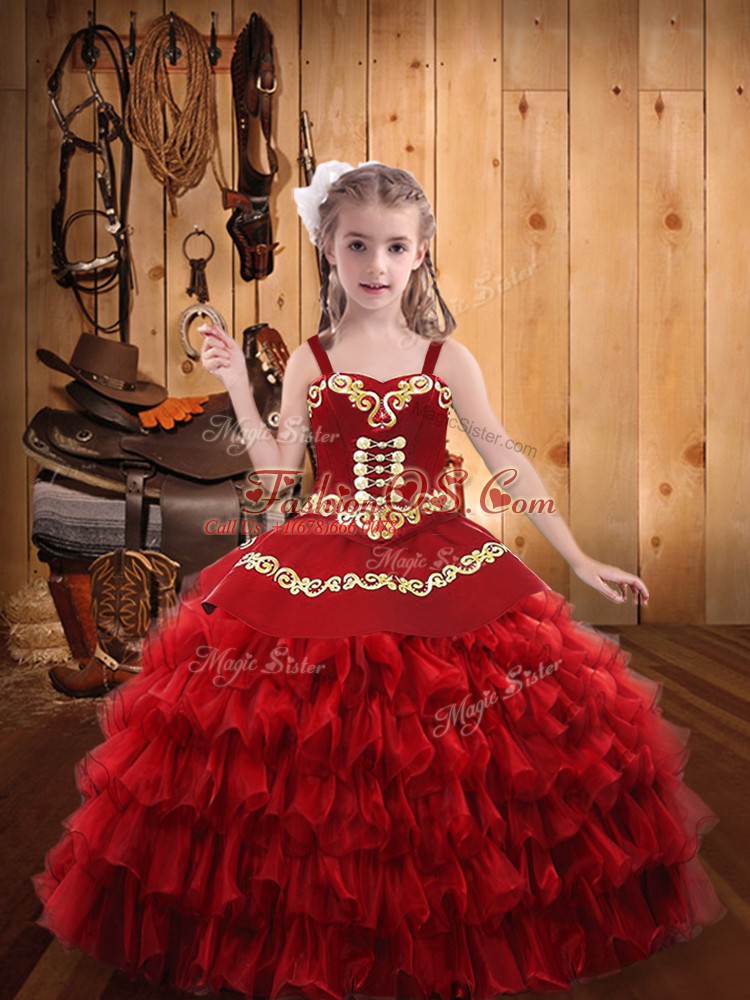 Red Sleeveless Embroidery and Ruffled Layers Floor Length Child Pageant Dress