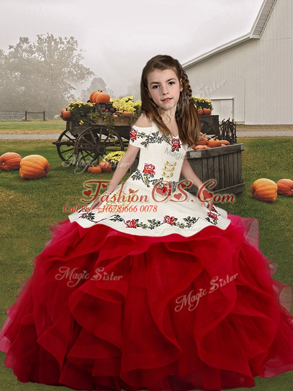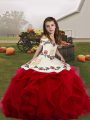Red Sleeveless Floor Length Embroidery and Ruffles Lace Up Kids Formal Wear