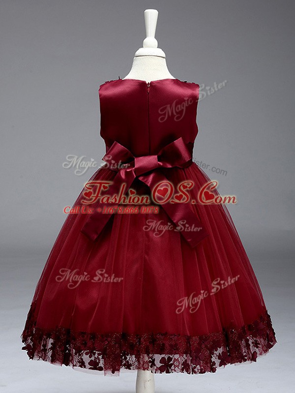 Red Sleeveless Tea Length Appliques and Bowknot Zipper Pageant Gowns For Girls