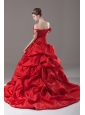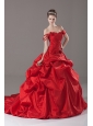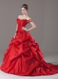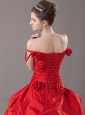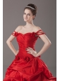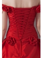 Red Taffeta Off The Shoulder Handle-Made Flower Ball Gown Court Train Quinceanera Dress