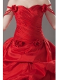 Home >  Quinceanera Dresses >  Fashionable Quinceanera Dresses > Red Taffeta Off The Shoulder Handle-Made Flower Ball Gown Court Train Quinceanera Dress