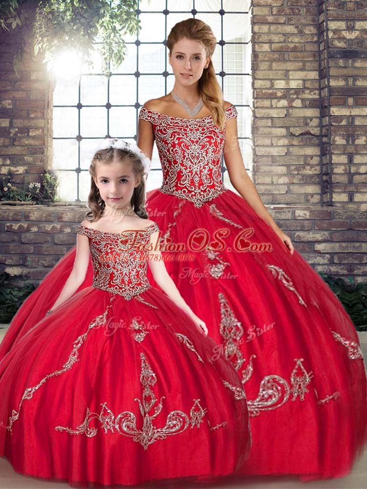 Red Tulle Lace Up Sweet 16 Dresses Sleeveless Floor Length Beading and Embroidery