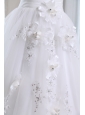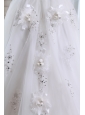 Flowing lines give this asymmetric wedding gown a dramatic, windswept look. The single strap adorned with a flower sweeps to the waist band that contours your curve. The full skirt hemed with exquisite lace appliques is highly embellished with sweet flowers that adds your feminie figure better than others. A hidden zipper up back secures the dress in place.