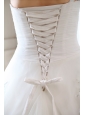If you're looking for a fashionable style wedding gown, this one takes the cake! It has a lovely pleated bodice with a subtle sweetheart neckline and pretty hand made flowers on the one shoulder strap that blend perfectly with the one on the right side of the waist and the silhouette respectively. Several floral appliques against with beadings around adorn the skirt of the dress incredibly. The material of the back extend to create a lovely train and a delicate lace up closure completes the design.