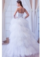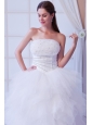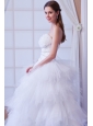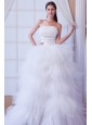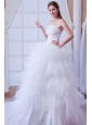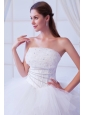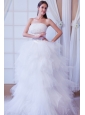 Romantic A-line Strapless Brush Train Tulle Beading Wedding Dress