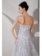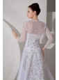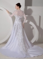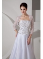 This Bridal wedding dress rivals those seen on the runway. This strapless gown has hundred of thousands of appliques overwhelmed with the entire bodice both front and back and those directly cascading down to the long brush train strikingly! This is a romantic gown that will look good for an indoor or outdoor event. Besides, a nice matching jacket of lace material is for great fit!