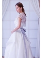 This A-line gown is everything that you've ever dreamed of a wedding dress could be! The notable dress creates a touching effect which makes you the hotline. It features a fitted corset bodice with appliques and a lovely sweetheart neckline. The lilac waistband accented with ruching highlights the body curve and a bowtie on the back will have heads turning. The focal point is the magnificent silhouette, great organza fabric creates lots of fullness in the design. The multi-ruffled hem is absolutely a feast for eyes. The dress sways beautifully across the floor when you move, as if you're floating on air. A lace up corset style closure in the back secures the dress in place.