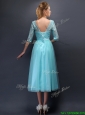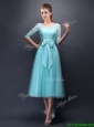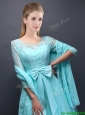 Romantic Aqua Blue Scoop Half Sleeves Prom Dress with Bowknot