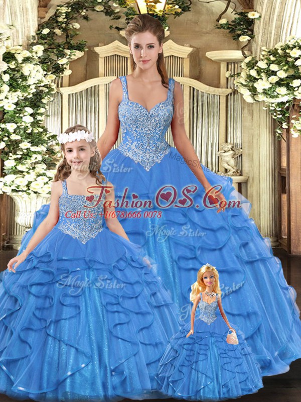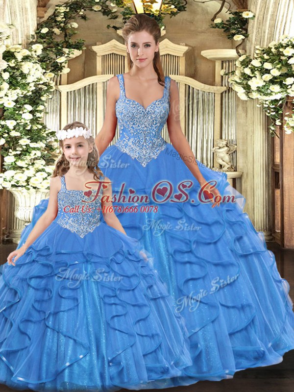 Home >  Quinceanera Dresses >  Detachable Quinceanera Skirts > Romantic Aqua Blue Straps Neckline Beading and Ruffles Vestidos de Quinceanera Sleeveless Lace Up