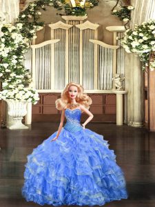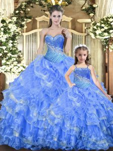 Romantic Baby Blue Ball Gowns Beading and Ruffles and Ruching Quinceanera Dress Lace Up Tulle Sleeveless Floor Length