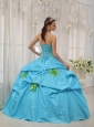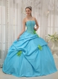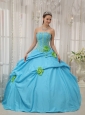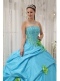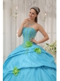Romantic Baby Blue Quinceanera Dress Strapless Taffeta Beading and Hand Flowers Ball Gown