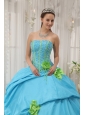 This blue quinceanera dress will be your best choice to attend a party.Its graceful A-line silhouette is sure to flatter your figure. Intricate floral patterns are embroidered across the form-fitting sweetheart bodice. A dazzling rosette punctuates the dropped waistline, and the flared skirt features overlapping overlays. large rose accents is sure to stay in the minds of every person you bump into.