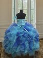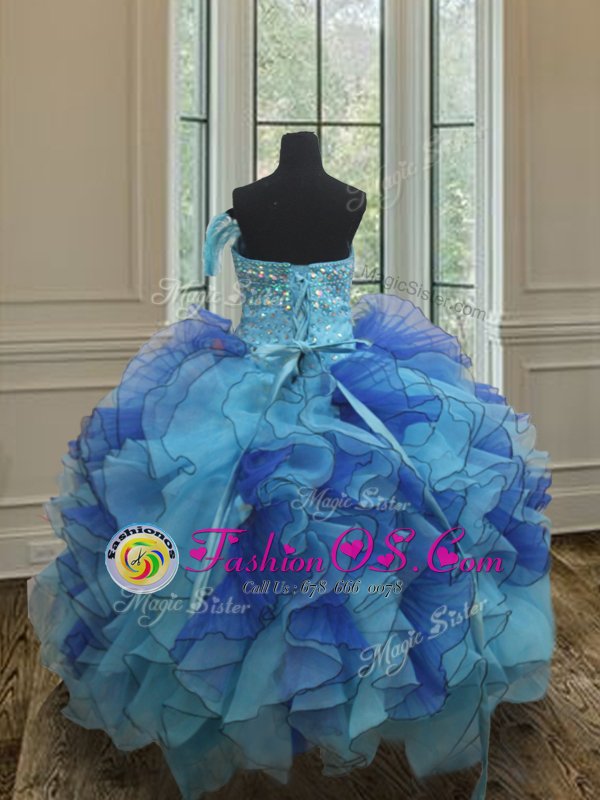 Romantic Blue Ball Gowns Organza Strapless Sleeveless Beading and Ruffles Floor Length Lace Up Flower Girl Dress