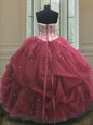 Home >  Quinceanera Dresses >  Cute Quinceanera Dresses > Romantic Burgundy Sleeveless Floor Length Sequins and Pick Ups Lace Up 15 Quinceanera Dress