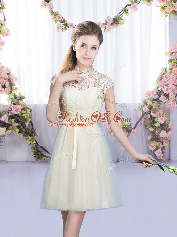 Romantic Champagne Tulle Lace Up Quinceanera Court of Honor Dress Cap Sleeves Mini Length Lace and Bowknot