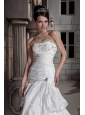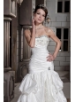 This perfect mermaid wedding dress shows off your curves. It has a lovely sweetheart neckline, fitted form and beautiful beading throughout. Exquisite yet trim pleats decorate the bodice. The mermaid-style skirt is made from several layers of ruched fabric that add fullness and shape to the design. In addition, floating lace fabric on the front of skirt adds a special beauty on the dress. The sweeping train creates a beautiful focal point. A corset-style closure secures the dress in place and ensures a perfect figure. You will never miss the chance to be most beautiful bride in this superb dress.